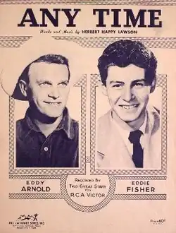 "Any Time" is a Tin Pan Alley song written by Herbert "Happy" Lawson. It was published in 1921 and first recorded by Emmett Miller for OKeh Records in 1924, accompanying himself on ukulele, Lawson recorded his own version for Gennett Records on July 31, 1925. It became associated with Country music when Eddy Arnold rescued it from obscurity in 1948, topping the Billboard Juke Box Folk Records Chart for nine weeks.[7]