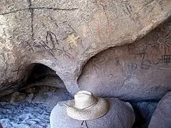 The Native Americans of the surrounding mountains and deserts include the Cahuilla, Cupeño, and Kumeyaay (Diegueño) Native American tribes. It was the homeland of these peoples for thousands of years, and their artists created petroglyph and pictogram rock art expressing their cultures.[22] Common foods of their diets included the Agave deserti, jumping cholla cactus, jackrabbit, bighorn sheep, and Indian rice grasses. Food-processing and harvesting was labor and time intensive. Roasting pits, bedrock milling and grinding features, cupule petroglyphs, and bedrock mortars all lead to this conclusion. Many artifacts have been found, such as obsidian, pumice, and fish bones, which tell us that these communities had extensive regionally internal trade networks. These were all observed at the CA-SDI-813, also known as the Mine Wash Site in Anza-Borrego Desert State Park.[23]