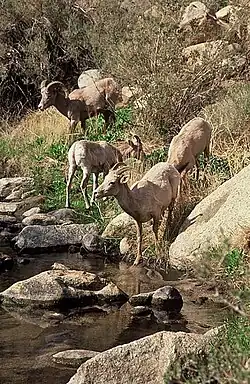 Some areas are habitats for the desert bighorn sheep. The peninsula bighorn sheep reside in Anza-Borrego. They have been federally endangered since 1998 and are one of the most iconic species of this state park.[3] Observers count this endangered species to study the population, and monitor its current decline from human encroachment.[15] The two biggest threats to bighorn sheep populations are anthropogenic influences and climate change. As humans continue to develop in Anza-Borrego Desert State Park and the surrounding area, bighorn sheep continue to lose their habitat. Coupled with the increasing extreme temperatures and decrease in precipitation, bighorn shape face a decreasing free-standing water availability crisis. Bighorn sheep face considerable habitat loss at the hands of humans ranging from water diversion to noise pollution and habitat fragmentation. As critical members of this desert biome, it is important to recognize the necessity to protect them and mitigate our impact on their limited and unique environment.[16]