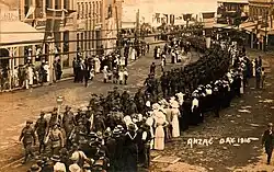 Anzac Day was then, in part, conceived as a solemn memorial day to honour those who had given their lives for the nation and the British Empire. It was hoped that the widespread grieving might be consoled by the public acknowledgment that their loved ones had died in a just and honourable cause. However, the day was designed from the outset to serve many purposes. Its organisational origins lay with the Queensland Recruiting Committee.[8] The inclusion of a military march was specifically designed to promote enlistment and to galvanise the nation's war effort. The notion that 25 April 1915 constituted the "birth of the nation" had been articulated since Empire Day (24 May) speeches in May 1915. By April 1916 that notion of the "birth of the nation" had wide currency.[9] A powerful Anzac mythology was built up around the military prowess of the Australian soldier which accompanied that narrative of national birth.[10] The first Anzac events in Brisbane and elsewhere were a combination of civic requiem, recruiting rally, fund-raising carnival and celebration of nationhood – with different representative phases of the commemoration emphasising those aspects. People thronged the streets in April 1916 to cheer the parading soldiers in such numbers that there were major issues of crowd control on some parts of the march.[2][11]