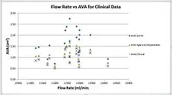 The Agarwal-Okpara-Bao equation is a new form of AVA evaluation equation named after Ramesh K. Agarwal, Emmanuel c Okpara, and Guangyu Bao.[4][5] It was derived from curve fitting of CFD simulation results and 80 clinical data obtained by Minners, Allgeier, Gohlke-Baerwolf, Kienzle, Neumann, and Jander [6] using a multi-objective genetic algorithm. The comparison of the results calculated from Gorlin Equation, Agarwal-Okpara-Bao Equation, and clinical data is shown in the figures on the right.
