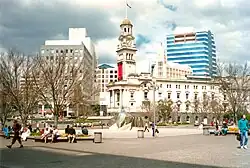 To the south of the square are the Administration block of the Auckland City Council and the entry to Myers Park.
