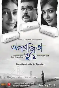 Aparajita Tumi (English: You, Undefeated) is a 2012 Indian Bengali-language drama film directed by Aniruddha Roy Chowdhury. The film stars Prosenjit Chatterjee, Kamalinee Mukherjee, Padmapriya Janakiraman, Chandan Roy Sanyal, and Indraneil Sengupta. It is a venture of director Aniruddha Roy Chowdhury after his successful and critically acclaimed movie Antaheen. This film also had Shantanu Moitra as the music director and Anindya and Chandril as lyricists like Tony's previous film. The film is an adaptation of the novel Dui Nari Hathe Tarbari by famous Bengali writer Sunil Gangopadhyay.