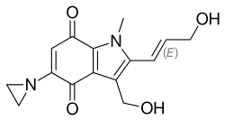 Apaziquone (tentative trade name EOquin)[1] is an indolequinone that is a bioreductive prodrug similar to the older chemotherapeutic agent mitomycin C. In hypoxic cells, such as those on the inner surface of the urinary bladder, apaziquone is converted to active metabolites by intracellular reductases. The active metabolites alkylate DNA and lead to apoptosis.[2] This activity is preferentially expressed in neoplastic cells.