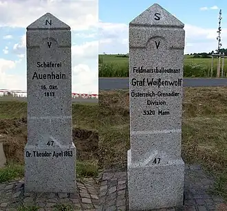 The Apel-stones, named after the writer Theodor Apel from Leipzig who commissioned them, mark important events during the Battle of Leipzig. There are 50 in total. They were sculpted by A. F. Aster, and put up between 1861 and 1865.[1]