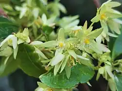 The Aphanopetalaceae are scrambling shrubs with lenticellate stems, having opposite and serrate leaves with minute "stipules". The flowers and inflorescences are axillary. The flowers are essentially without petals, and have four large, white sepals that enlarge when in fruit (which is single-seeded).[5]