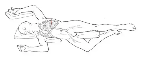 The patient is placed on the table in the supine position. Anesthesia is induced, and the patient is intubated with a double-lumen endotracheal tube, which facilitates one-lung ventilation and allows the surgeon to work within the left chest. The patient is positioned with his or her left side up (see figure). A left anterior-lateral thoracotomy is performed between the fifth and sixth ribs to expose the heart and provide access to the descending aorta. A portion of a rib may be removed to enable easier access and to minimize the chance of a rib fracture. The left lung is deflated and retracted.