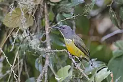 The Apo sunbird is a bird local to the island of Mindanao in the Philippines. It can be found in mountainous areas in the western and central parts of the island, specifically, Mount Apo, Mount Kitanglad, and Mount Malindang.[6] Its natural habitat is in montane rainforest above 1,500 meters above sea level for boltoni and malindangensis but much lower with the lowest record at just 800 meters above sea level.[6]