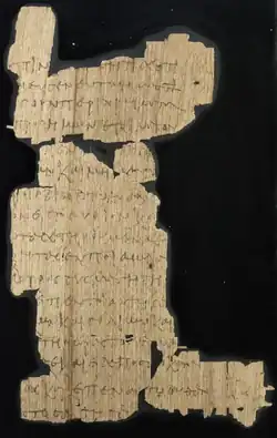 CBL BP XVI in the Chester Beatty Library in Dublin is the most important witness to the Greek text.[2] It consists of 100 papyrus fragments, 99 of which are now mounted in eight glass frames.[7] The fragments come from a codex.[11] They were bound as a single quire of at least 24 pages.[12]