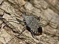 Apodiphus amygdali can reach a length of about 15 millimetres (0.59 in) and a width of about 8 millimetres (0.31 in). The females are slightly larger than the males. Body is oval, convex dorsally, blackish brown, densely speckled with yellow ocher spots. The pronotum has dentate and concave lateral margins. On the head and pronotum, there is a short ocher or yellowish longitudinal line. The connexivum shows black and ocher or yellowish spots. The long legs and antennae are gray-brown to black.[2]