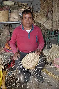 The artisan lives in a rural area in central Mexico among orchards and cornfields, with pine forests in the higher mountains. He works on his corn fields during the rainy season, concentrating on his weaving during the rest of the year.[1] He learned basket weaving from his father, admiring the elder’s work and has tried to teach the same appreciation to this own children. He has also taught many other young people.[2]