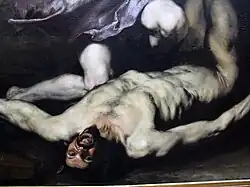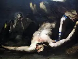 In both of the last two paintings mentioned, the painter distorted the scene, so much so that Marsyas is no longer seen tied to the tree by his legs, as in the Ribera model, but rather by his arms, where the flaying began.[8] Both versions, however, retain some analogies with the Capodimonte painting: above all Apollo, who is represented similarly even in the colours of the clothes (wisteria cape, blue dress and shoes), although this similarity is more evident in the Florentine version. Furthermore, the Tuscan painting resembles the Neapolitan one also in the nocturnal setting of the scene and in the figure of the satyrs in the background, while the Spanish version is set during the day. The Escorial painting also features several figures scattered across the background, including King Midas with donkey ears, while recalling the Neapolitan version of the canvas in the detail of Apollo's foot towering over Marsyas' body.[8]