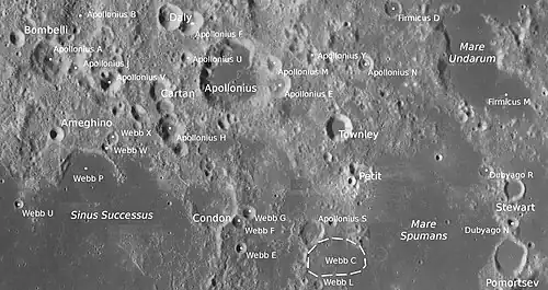 By convention these features are identified on lunar maps by placing the letter on the side of the crater midpoint that is closest to Apollonius.