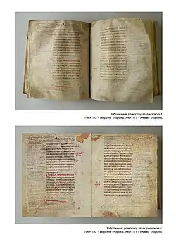 The Apostolus Christinopolitanus is a Cyrillic manuscript of the Acts and Epistles with commentary, written in Church Slavonic of the East Slavonic recension in the middle of the twelfth century. It takes its name from the town of Krystynopol (now Sheptytskyi), where it was kept until 1908. The greater part of the manuscript (291 leaves), is now in the Historical Museum in Lviv (MS 39); eight leaves are in the National Library of Ukraine in Kyiv (MS VIII.3),[1] and four more in the Czartoryski Library at the National Museum in Cracow (MS 11601). These last came to light only in 2020.[2]