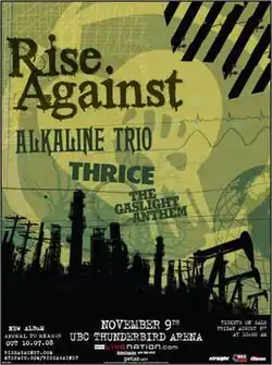 In the first official leg in the promotion of the Appeal to Reason album, the band was supported by Alkaline Trio, Thrice and The Gaslight Anthem through all the US (with some Canadian dates), this was followed by a series of Canadian dates in December, supported by Thursday and Sage Francis. The band then embarked on an Australian leg in the beginning of 2009, followed by a European leg, which was supported by Strike Anywhere and Rentokill, with all UK dates supported by Anti-Flag and Flobots (except the two last ones, where The King Blues replaced Anti-Flag). The band then returned to Australia, supported by The (International) Noise Conspiracy, and then embarked on a short Japanese tour, with a full-length North American summer tour. The first of it was supported by Rancid and Riverboat Gamblers, with the second part supported by Billy Talent and Rancid. The band then returned for another European leg, playing mainly festivals in the summer, with a winter headlining leg, supported by Thursday and Poison the Well.