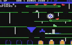 When the three screens have been completed, the game starts again, but with added dangers. These include various animals that hop along the platform as well as blocker bars on the ladders that the spider uses to move upwards.
