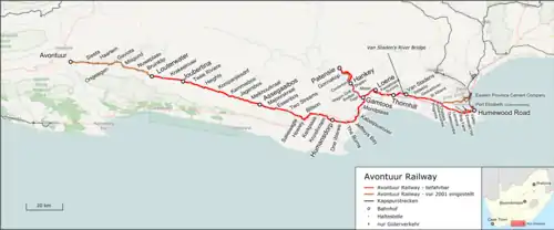 The Avontuur Railway is a closed railway line between Gqeberha and the town of Avontuur in the Western and Eastern Cape provinces of South Africa. It is the longest 610 mm (2 ft) narrow gauge route in the world at a length of 285 kilometres (177 mi).[1] "Avontuur" is the Afrikaans and Dutch word for "adventure".