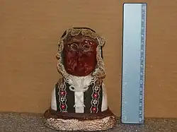 As colonists came into contact with Native peoples, they copied their dolls; Native peoples also began to make brightly and elaborately costumed apple-head dolls to sell to tourists.[4] Skookum dolls in Native dress, which were popular novelties between 1913 and the early 1960s, were originally made with apple heads; however their creator, Mary Dwyer McAboy, was not Native.[5]