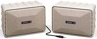 In September 1986, Apple sold a special edition of the Bose RoomMate speakers for the Apple IIGS computer—which sports a built-in Ensoniq synthesizer chip with optional stereo sound. The front grille of each speaker had the Bose logo inside a black rectangle, and the official rainbow Apple logo in a square next to it. The speakers matched the platinum gray color scheme introduced with the IIGS that year. Later editions of the speakers, likely for legal issues pertaining to Apple Records, replaced the Apple-shaped logo with a rainbow-colored square, and eventually removed any Apple reference entirely. The powered speakers lacked a variable volume knob or magnetic shielding (a warning label stated to keep it distanced from the CRT and magnetic storage) and retailed for US$229.99 (equivalent to $660 in 2024). Although primarily intended for the Apple IIGS which it cosmetically matched and better suited for its advanced audio capabilities, the speakers were also made available for early Macintosh models.[1]