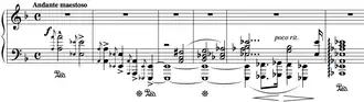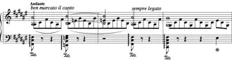 The piece is divided into two main subjects. The first, a chromatic theme in D minor, typifies the wailing of souls in Hell. D minor is a common key for music relating to death, as evidenced by other compositions such as Liszt's Totentanz[5] and the statue scene of Wolfgang Amadeus Mozart's Don Giovanni. The first theme also heavily uses the tritone (augmented 4th or diminished 5th); this interval was known as the Devil's interval (or "Devil in music") and further reinforces the hellish imagery. The second theme is a beatific chorale in F-sharp major, derived from the first, which represents the joy of those in Heaven.[6] The key is also symbolic here, being the signature for other uplifting works of Liszt's, including Benediction of God in Solitude (part of Harmonies poétiques et religieuses)[7] and Les Jeux d'eaux à la Villa d'Este (Années de pèlerinage, vol. 3, no. 4).[8] The secondary theme may also represent Beatrice, as it is interspersed within chromatic areas, similar to the character's appearances in hell. The piece ends with a rapid chromatic octave section that when played at speed seems to split into three distinct themes, reflecting Satan's three faces in Dante's Inferno.