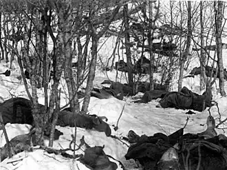 - Battle of Rautu – The Red Guards broke through the White Guard line and attempted to escape to Petrograd. However, the column was caught in a machine gun cross-fire in a valley near Kuolemanlaakso, Finland at the Russian-Finnish border, where 400 men were slaughtered along with dozens of civilians from the nearby village. Another 800 to 900 Red Guards were taken prisoner. The Whites Guards lost 270 casualties in the final two days of the battle. The Kuolemanlaakso valley was nicknamed the "Valley of Death" following the massacre.[36]