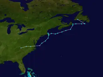 The nor'easter then proceeded to make two consecutive landfalls, first in Dukes County, Massachusetts and again near Hyannis, Massachusetts between 12:00 and 15:00 UTC, as it reached its peak intensity of 988 millibars (29.2 inHg) over Cape Cod.[19] While maintaining peak intensity, the nor'easter made a third landfall near Kingston, Massachusetts at 21:00 UTC, before making a fourth and final landfall near Barnstable, Massachusetts at 00:00 UTC on April 17.[20][21] After this point, the nor'easter began to steadily weaken while moving northeast toward Nova Scotia, and later passing to the south of it.[22][23] The weakening nor'easter then slowly meandered east of Nova Scotia, moving to the northeast and making landfall along the southern coast of Newfoundland at 00:00 UTC on April 20, with a central pressure of 998 millibars (29.5 inHg).[24] After coming ashore, the nor'easter began to rapidly weaken, dissipating over eastern Newfoundland later that day.[25]