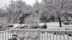 The April 2021 nor'easter, also referred to as the 2021 Spring nor'easter, was a significant late-season nor'easter that impacted much of New England with heavy snowfall, gusty winds, thundersnow, and near-whiteout conditions from April 15–17, 2021. The system originated from a weak frontal system late on April 14 over North Carolina, which moved into the ocean the next day and began to strengthen. The low-pressure steadily deepened as it moved up the East Coast, and developed an eye-like feature just prior to peak intensity. It prompted a fairly large area of Winter Storm Warnings across interior sections of New England, with Winter Weather Advisories being issued closer to the coast. Over 20,000 customers lost power at the height of the storm on April 16 due to heavy wet snow, and near-whiteout conditions were reported in many areas.[4] Several injuries, some serious, occurred as well, mostly due to traffic incidents on poorly-treated roadways during the storm.[5][6][7] Damage estimates from the system are currently not calculated.