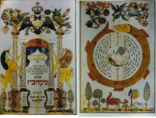 ![]() Illuminated pages from the pinkas ("minutes") books of the Mishnah Society of the Apter Rov's kloyz, Medzhybizh, circa 1840. | |