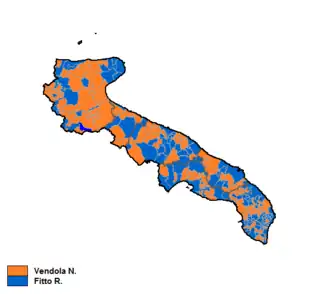 Nichi Vendola (Communist Refoundation Party) defeated incumbent Raffaele Fitto (Forza Italia). The success of Vendola came somewhat unexpected. In a Southern Italian Region, expected to be morally conservative, Vendola, a communist and homosexual, defeated Fitto, a conservative Christian democrat. Vendola was the first candidate ever to be appointed by its coalition through a primary election instead of agreements between parties. A defeat of Vendola might have resulted in a cancellation of the primary election of The Union for choosing the candidate for Prime Minister in the 2006 general election.