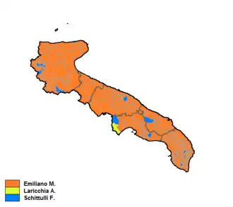 The centre-left candidate Michele Emiliano won the election with a large margin from the Five Star Movement's candidate, Antonella Laricchia. The centre-right coalition broke up, presenting two different candidates, Francesco Schittulli, supported by former governor Raffaele Fitto, and Adriana Poli Bortone, supported by Silvio Berlusconi's Forza Italia, who arrived third and fourth.