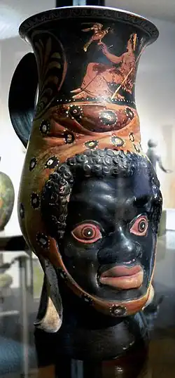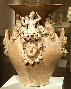 There are four principal forms. The first is a round-bottomed footless krater with side handles and a plate-like rim (cf. example 1); the second is a similar krater on a pedestal. This latter is the shape known in Picenum, where its occurrence at Novilara puts its date at least as early as 600BC. From the round-bottomed krater is evolved the most peculiar and characteristic product of Canosa, that is, the double-storied jar. The plate-like rim has been developed into a deep bowl, which becomes more and more exaggerated during the 5th century until eventually it takes up nearly half the height of the entire jar. Strange fanciful additions are then made in the way of plastic ornament. To the ordinary ring handles are added a third and even a fourth, of increasingly fantastic kind. They may take the shape of an animal's face, most like a cat or an owl, or be formed like a thumbless human hand, which had probably some talismanic value. The fourth principal shape of pot is that which is known in Greece as an askos (cf. example 2), derived originally from an ordinary goatskin, and know at an early date over much of Sicily and Italy, but perhaps introduced by the Greeks.[1][3]