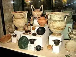 - ^ a b c d e f g h For the main sections of this article, these primary sources have been consulted and referenced throughout the text: Walters, Henry Beauchamp (1911). . In Chisholm, Hugh (ed.). Encyclopædia Britannica. Vol. 5 (11th ed.). Cambridge University Press. pp. 703–760. with its basic bibliography and notes, especially useful in the illustration of specific pottery; Stephen B. Luce, "Early Vases from Apulia", The Museum Journal, Volume X, December, 1919, Philadelphia: The University Museum, 1919, pp. 217-225; the essential texts by Michele Gervasio(it), Bronzi arcaici e ceramica geometrica nel Museo di Bari, Bari, 1921, for which see also E. Douglas Van Buren's synoptical review on JStor: Classical Philology, Vol. 17, No. 2, Apr., 1922, pp. 176-179; also Michele Gervasio, I dolmen e la civiltà del bronzo nelle Puglie, Bari, 1913; Filli Rossi, Ceramica geometrica apula, Bretschneider Giorgio, 1981, as well as his Ceramica geometrica daunia, Dedalo, 1993. Fundamental work is the German Maximilian Mayer, Apulien vor und während der Hellenisierung, B.G. Teubner, 1914 as well as his specifically researched Molfetta und Matera, Karl W. Hiersemann, 1924. Generally, compare the requisite David Randall-MacIver, The Iron Age in Italy, Clarendon Press, 1927.