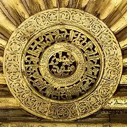 Near the grilled window, on the same side of the façade, are carved panels representing doors. One possible interpretation of the doors is in reference to the famous Shi'i hadith: "I am the city of knowledge and 'Ali is its gate".[7] The carved panels could also have a political interpretation rather than a religious one, representing the doors of the caliph's court (Bab al-Majlis) in connection with the official role of the mosque's founder, al-Ma'mun al-Bata'ihi, as master of the door (Sahib al-Bab); thereby symbolizing the Fatimid vizier's function in governing who had access to the caliph.[15] Although the grilled window and the carved door panels represent real objects, their particular use as part of the façade's decorative scheme grants them a metaphorical meaning associated with the historical framework of Fatimid caliphal rituals.