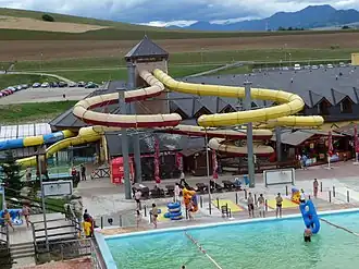 Aquapark Tatralandia Holiday Resort is the biggest aqua-park in Slovakia and one of the biggest in Central Europe. It is located 4 km north-west from town Liptovský Mikuláš in Ráztoky, on the north bank of dam Liptovská Mara. The source of the thermal water is a mineral spring coming from a 2500m deep bore with temperature of 60.7 °C. There are 9 thermal pools, 6 of them are open all year-round; while 2 of them are covered, with water temperature around 38 °C. Located in the close proximity of the Tatra Mountains, the waterpark resort is open daily from 10am-10pm, and is open most of the year.