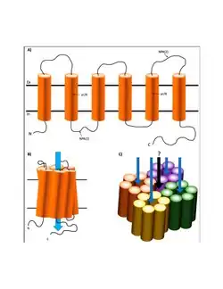 Aquaporin-4, also known as AQP-4, is a water channel protein encoded by the AQP4 gene in humans.[5] AQP-4 belongs to the aquaporin family of integral membrane proteins that conduct water through the cell membrane. A limited number of aquaporins are found within the central nervous system (CNS): AQP1, 3, 4, 5, 8, 9, and 11, but more exclusive representation of AQP1, 4, and 9 are found in the brain and spinal cord.[6] AQP4 shows the largest presence in the cerebellum and spinal cord grey matter.[7] In the CNS, AQP4 is the most prevalent aquaporin channel, specifically located at the perimicrovessel astrocyte foot processes, glia limitans, and ependyma.[8] In addition, this channel is commonly found facilitating water movement near cerebrospinal fluid and vasculature.[9]