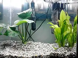 Live plants in an aquarium utilize the final product in the nitrogen cycle of nitrate as fertilizer, helping the nitrate levels stay minimal. This 60-litre (13 imp gal; 16 US gal) aquarium contains Anubias barteri and Echinodorus bleheri. A heater and small filter are in the background.