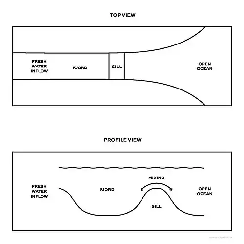Aquatic sills can influence water circulation by restricting the movement of bottom water masses, resulting in partial to total separation of two basins. The restricted water circulation affects temporal variations in salinity and can result in oxygen depletion in deeper water masses.[5]