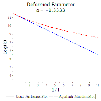 What it is call the sub-Arrhenius behaviour would be accounted for traditionally by introducing a tunnelling parameter () in the conventional Transition-State-Theory. In the -TST formulation, it is replace the factor in the TST rate constant by the deformed exponential function, Eq. (3), yielding:[18]