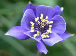 The flowers on this species are violet, fragrant, and relatively small, ranging between 20 mm (0.79 in) and 54 mm (2.1 in) in diameter. The five sepals are ovate-lanceolate or ovate in shape, coming to an acute end. Each sepal is 10 mm (0.39 in) to 27 mm (1.1 in) wide and 5 mm (0.20 in) to 12 mm (0.47 in) long. The five petals are also relatively short at between 13 mm (0.51 in) and 28 mm (1.1 in) in length. The petals' limbs are longer than the nectar spurs, with dimensions of between 9 mm (0.35 in) and 16 mm (0.63 in) wide and 6 mm (0.24 in) and 13 mm (0.51 in) long. These limbs are oblong-elliptic or obovate in shape and come to rounded or rounded-truncate ends. Each flower's petals form a heterogenous funnel shape, with the upper portion of this arrangement radiating out to a diameter of 18 mm (0.71 in) to 28 mm (1.1 in).[3]: 399–400