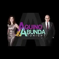 Aquino & Abunda Tonight is a Philippine television talk show broadcast by ABS-CBN. Hosted by Kris Aquino and Boy Abunda. It aired on the network's Primetime Bida line up from February 10, 2014 to September 25, 2015, and was replaced by Tonight with Boy Abunda.[1][2] The show also serves as a reunion for the host tandem three years after they did in SNN: Showbiz News Ngayon.