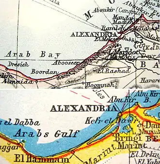 The Arab's Gulf, also known as the Arab Gulf or Arab Bay (all translating the Arabic name Khalij el-Arab, خليج العرب), is a large bay to the west of Alexandria in Egypt. It is not to be confused with the "Arabian Gulf" (a historic name for the Red Sea) or the Arabian Sea.
