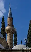 This mosque consists of a large hemispherical dome (about 6 metres diameter) carried on the usual Byzantine cruciform plan with pendentives. In front of the mosque is a porch covered with three smaller domes. No moulded or carved details relieve the severe simplicity of this characteristic Turkish monument. The current structure dates from 1845.