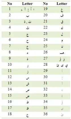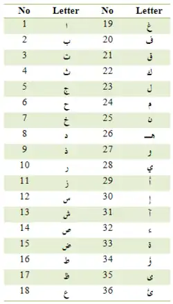 The Arabic alphabet consists of 28 primary letters, these are letters 1 to 28 in Table 1. The eight modified letters listed in positions 29 to 36 in the same table are used just the same. If these 8 modified forms are folded into the primary list based on shape or phonetic similarity, the outcome then is as shown in Table 2. For accurate frequency analysis, each of the 36 letters of Table 1 gets its frequency counted independently.
