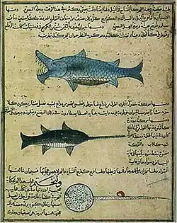 One of the last important illustrated Arabic manuscripts is a copy of Al-Qazwini's Wonders of Creation dated around 1370 and 1380 in Baghdad (Freer Gallery of Art, 54.33-114). It shows both Mongol and Persian influences, although it still remains faithful to the caliphal classical Arabic tradition. Subsequently, the few rare manuscripts still produced in this region lost their originality and almost totally assimilated to the Ottoman or Persian style.[55]