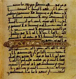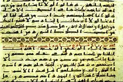 Its surahs are separated by ornamented horizontal bands. The manuscript also contains large circular rosettes, these are found after every 5 and 10 Ayahs, while rectangular shaped signs are found after every 100 verses and signs of similar shape following every 200 verses in some surahs.[39][40]