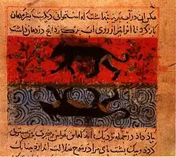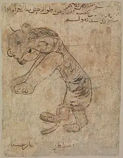 It is rare to have an example of both text and illustrations of the same page, which makes it difficult to gather information about illuminated manuscripts. In some cases, it is possible that illustrations were added to an already existing text at a later date.[48] Fatimid illustration style can be demonstrated by one surviving piece of paper, which was excavated in Cairo. This single sheet of paper has drawings on both sides; one side showing a lion, and the other, a hare. While it is unclear whether this page originated from a work of, potentially, scientific or zoological subject matter, it is an example of larger patterns of naturalistic and figural representation within Fatimid art.[50]