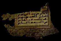 Written in the territory of modern Iraq in the Kufic script. Now kept in the Hast Imam library, in Tashkent, Uzbekistan.[42][43] Its verse endings are marked by small panels of diagonals lines; the tenth verse is marked with a square medallion illuminated in blue, green, red and manganese with a stellar design.[44]