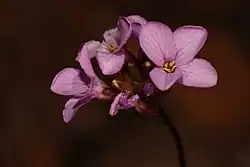 This is a perennial herb growing from a tough caudex covered in large hairs and the bases of leaves shed in previous seasons. It produces one or more upright stems to heights between 20 and 35 centimeters. The stems are dark in color, often reddish or purplish, and are coated in stiff white hairs. The leaves form a basal rosette about the caudex. They are oval-shaped, green in color and sparsely covered in coarse white hairs, up to 4 centimeters long, and with smooth or wavy edges. Leaves located higher up the stem are smaller. The flowers have dark purple sepals and lighter purple petals. The fruit is a long, thin, upright silique up to 6.5 centimeters long. The bloom period is between the months of April, May and June.[1] The leaves shape is elliptic, oblanceolate, and obovate. The leaf margin is entire. The inflorescence is raceme. The bloom color is pink or purple.[2]