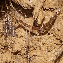 The larva spins a nest out of silk on the ceiling of the cave and then hangs down up to 30 silk threads along which it regularly places small sticky droplets.[13] Their prey largely include other small Diptera (especially midges)[10] although glowworms living on banks may also trap spiders and other non-flying invertebrates.[13]