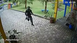 The shootings began at around 9:30 a.m. and occurred at two schools located on the same street.[2][11] During the shootings, the gunman wore camouflaged clothing, an armband with a swastika, a skull mask, and a bucket hat. He broke into the Primo Bitti Elementary and Middle School, a public school serving elementary and middle school students, after destroying the two locks to the side entrance gate with wrenches and a bolt cutter respectively. There, he used his .40 caliber pistol to shoot 11 people at the teacher's lounge, murdering two teachers at the scene.[12] A third teacher succumbed to the wounds she was left with and died a day later in the care of medics.[2][4][13] Rodrigues was standing in the doorway and reloaded once when he shot up the teacher's lounge.